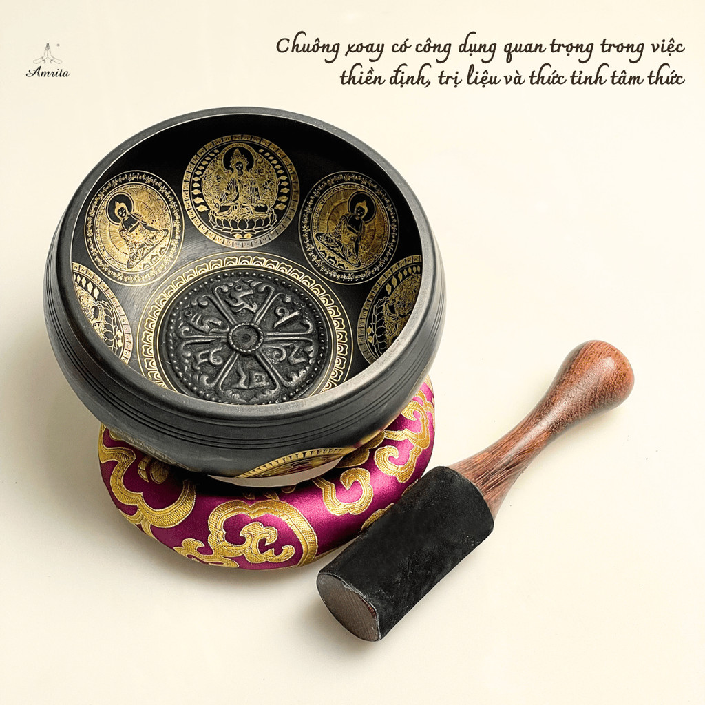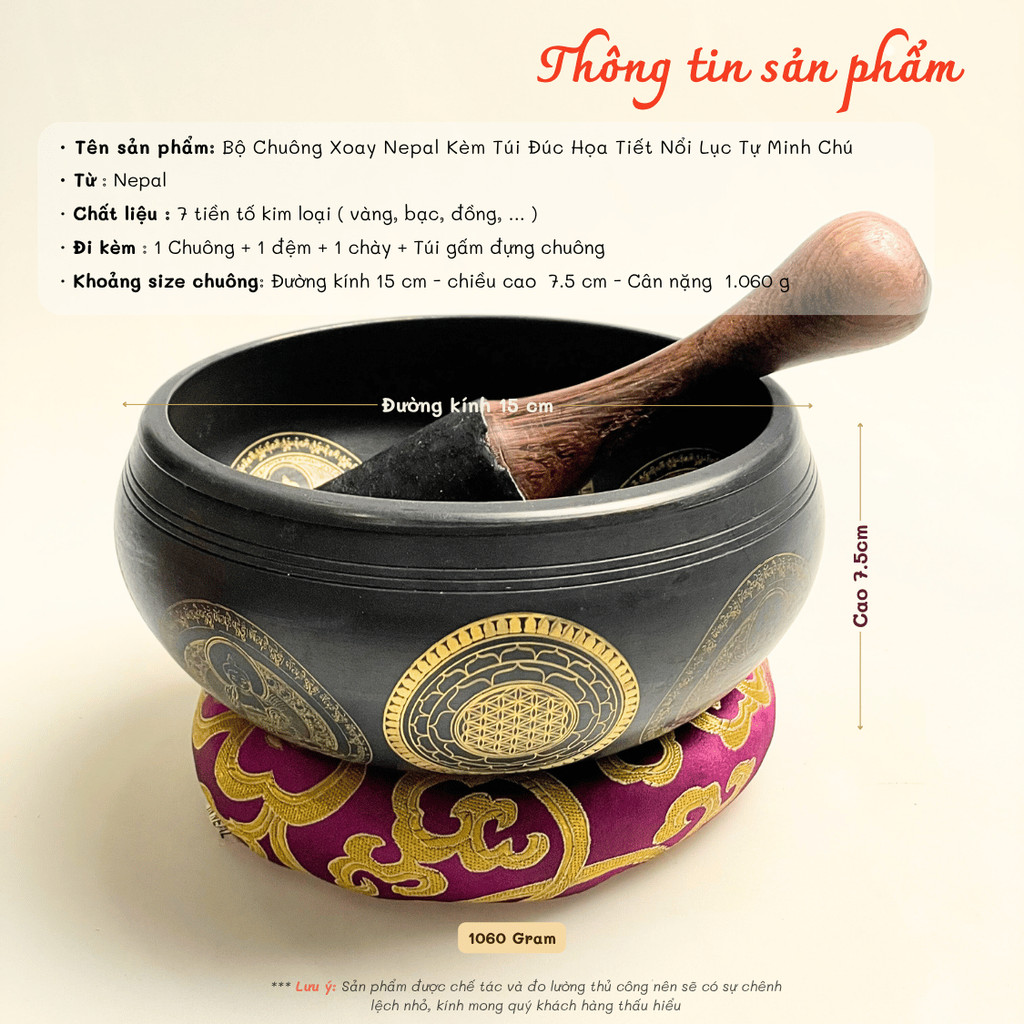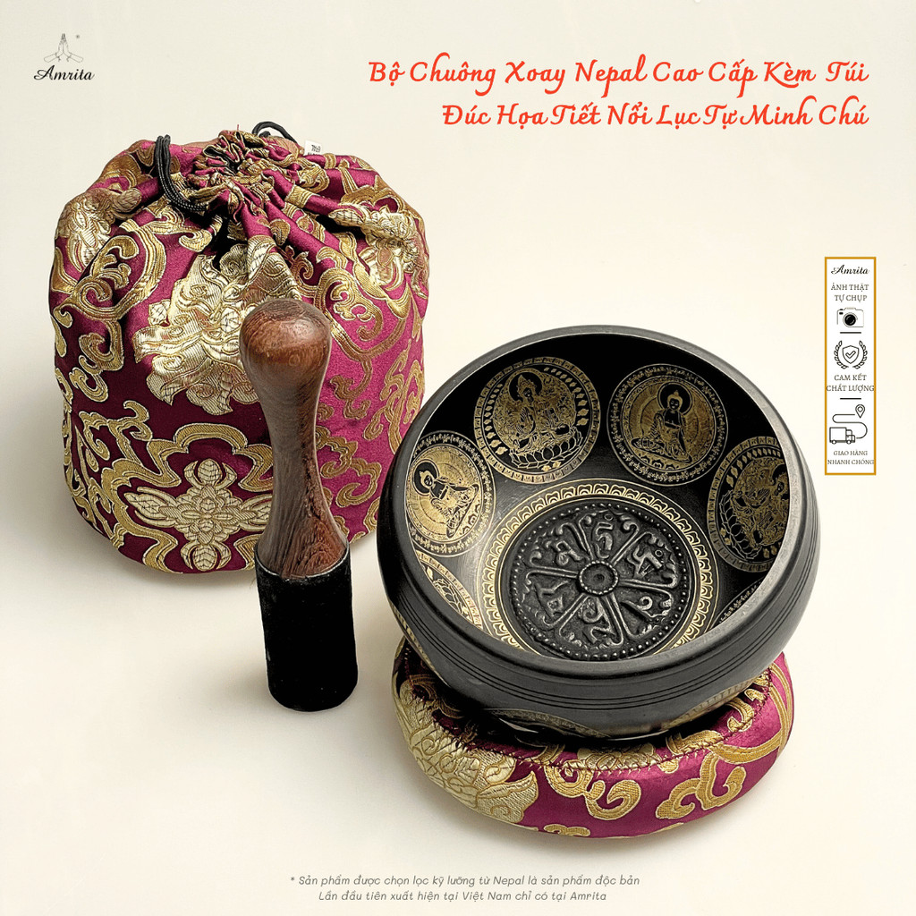 Bộ Chuông Xoay Nepal Cao Cấp Kèm Túi Đúc Họa Tiết Nổi Lục Tự Minh Chú
