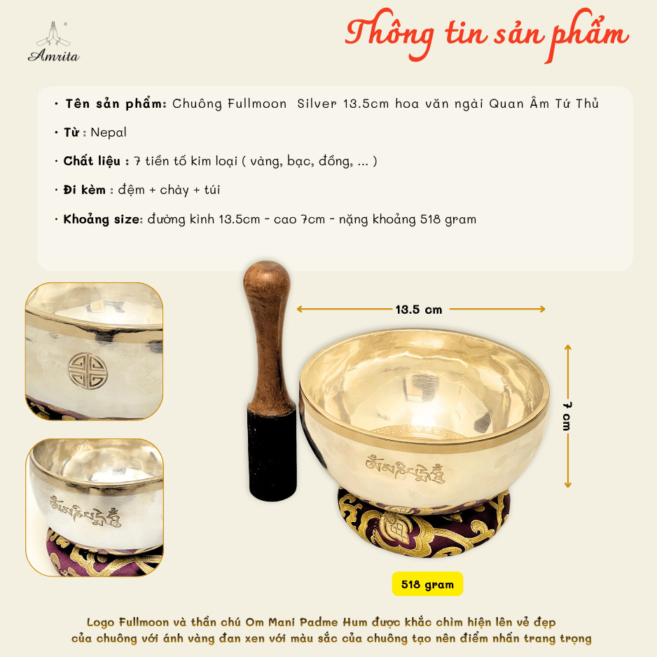 · Tên sản phẩm: Chuông Fullmoon Silver 13.5cm hoa văn ngài Quan Âm Tứ Thủ
