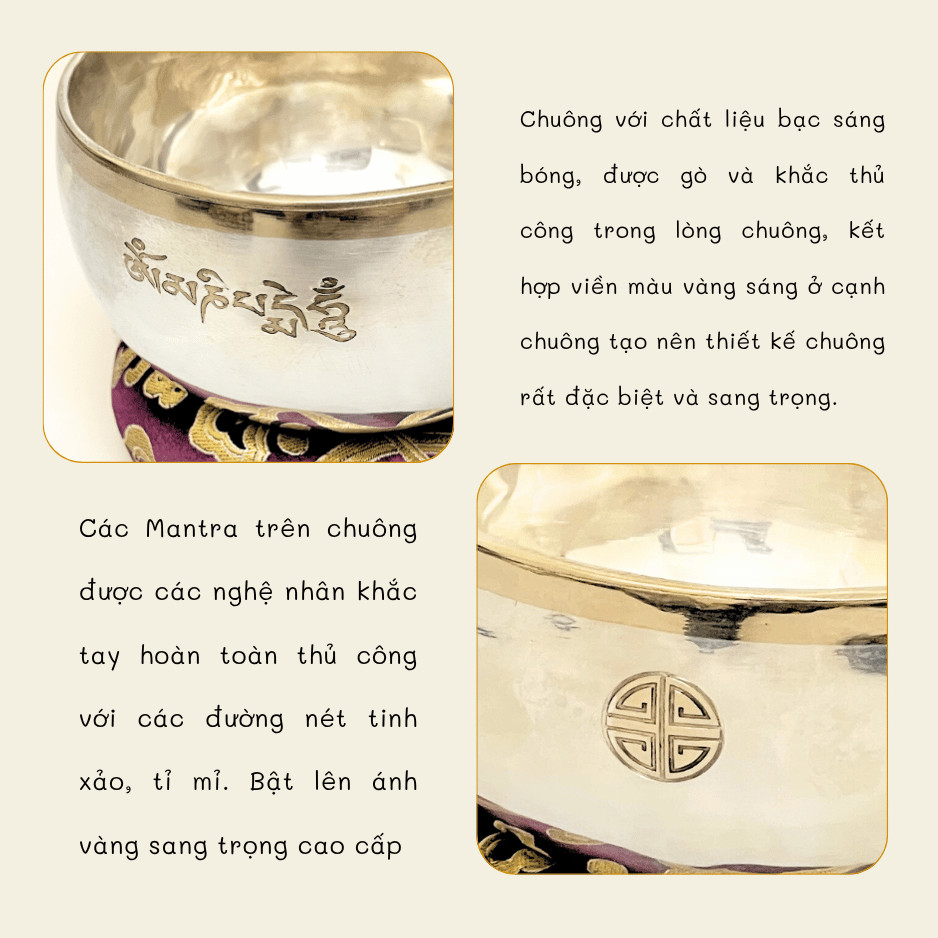 Chuông với chất liệu bạc sáng bóng, được gò và khắc thủ công trong lòng chuông, kết hợp viền màu vàng sáng ở cạnh chuông tạo nên thiết kế chuông rất đặc biệt và sang trọng.