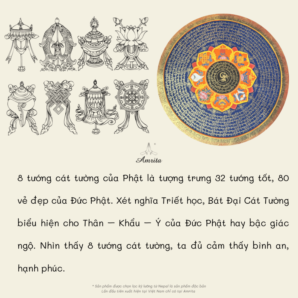 Tám biểu tượng cát tường chính là tám pháp khí mang điềm cát tường, may mắn và năng lượng gia trì hoàn hảo. Khi tám biểu tượng này kết hợp với nhau tạo thành một tổng thể gọi là Trí Tuệ Bản Lai và cũng chính là hóa thân của Đức Phật.